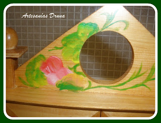 Cuelgallaves de madera. Está trabajado con tinte barniz de color  nogal. Se puede teñir del color deseado, a juego con la portería o los muebles. Las flores son pintura popular y están realizadas con la técnica de la multicarga al óleo.